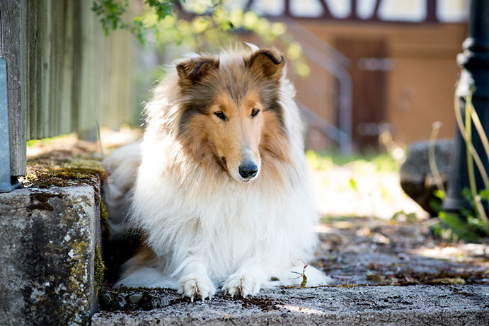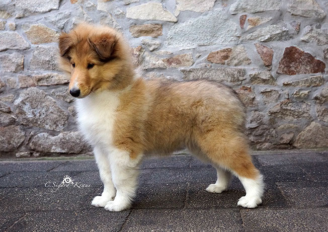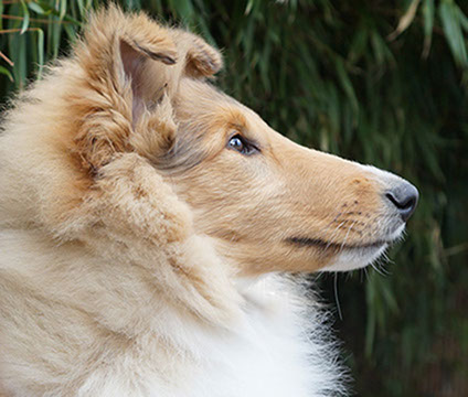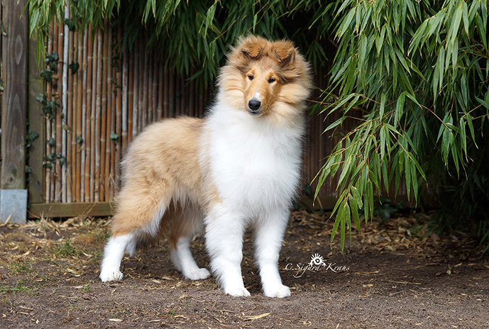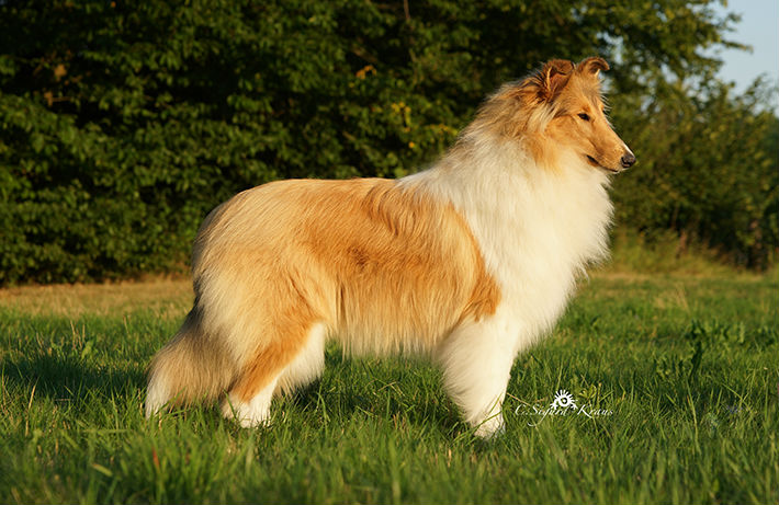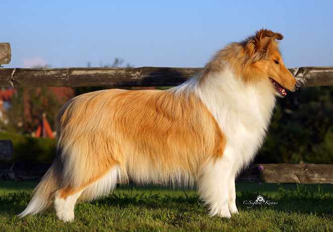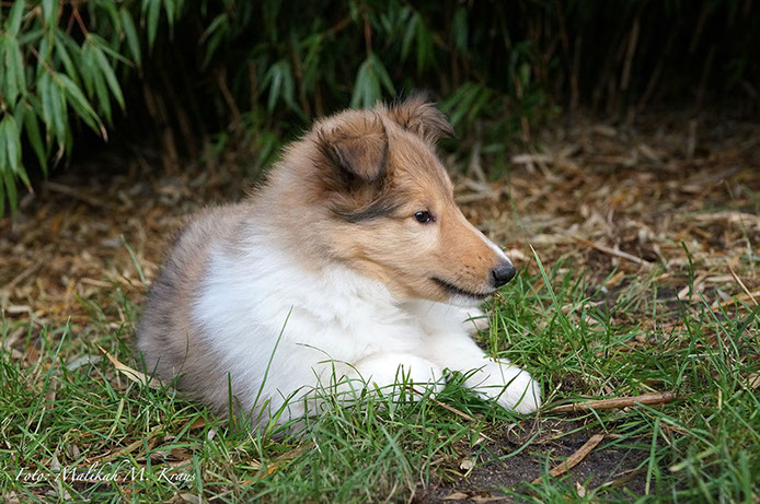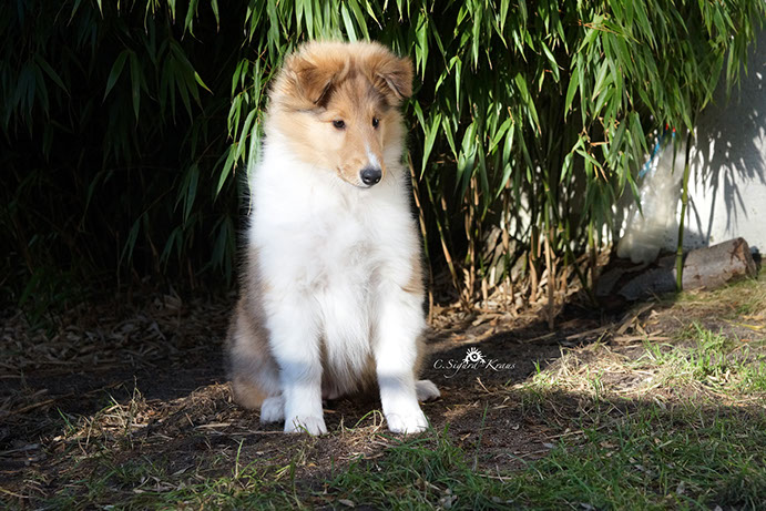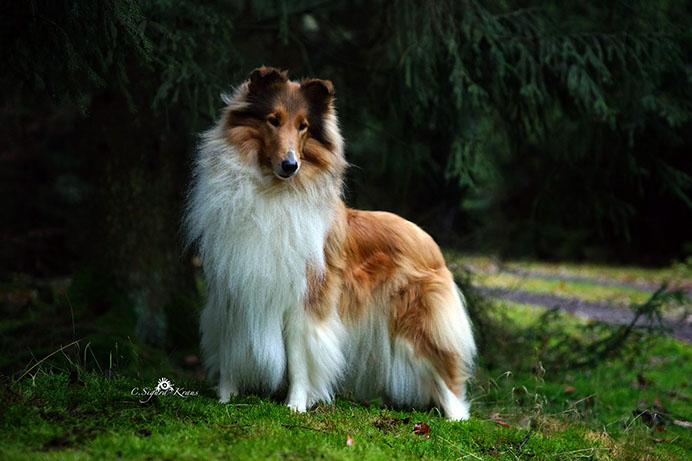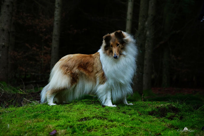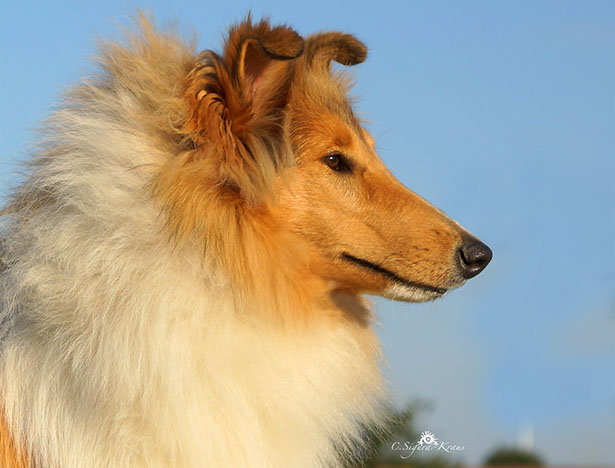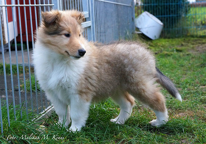'ZIVAH' ist für uns eine wunderschöne Hündin, mit schönen Außenlinien. Sie hat einen edlen Kopf, der ihr einen femininen Ausdruck verleiht. Bei dem Training (Gehorsam) zeigt sich ihre Intelligenz und ihr Fokus. Sie hat ein schönes Gangbild und eine sehr lange Rute. Bei allen bisherigen Würfen, hat sie sich vorbildlich verhalten. Wir sind sehr zufrieden mit dieser tollen Hündin und erfreuen uns an ihrer Nachzucht. Zivah lebt mittlerweile bei ihrer Tochter aus dem R-Wurf, ganz in der Nähe von uns. So können wir sie von Zeit zu Zeit besuchen. In ihrem neuen zu Hause gibt es eine kleine Schafsherde und Zivah freut sich ganz besonders, wenn sie dort auf Lämmchen aufpassen darf. Leistungseignung: Obedience, Therapiehund 'ZIVAH' is a beautiful intelligent girl in our opinion. She has outline, style and a fabulous pedigree. Furthermore she has a good movement and a very long tail. We are very pleased with this pretty collie girl and are pleased with her wonderful offspring. Zivah now lives with her daughter from the R litter, very close to us. So we can visit from time to time. There is a small flock of sheep in her new home and Zivah is particularly happy when she is allowed to look after the little lambs there. Suitability: Obedience, Servicedog