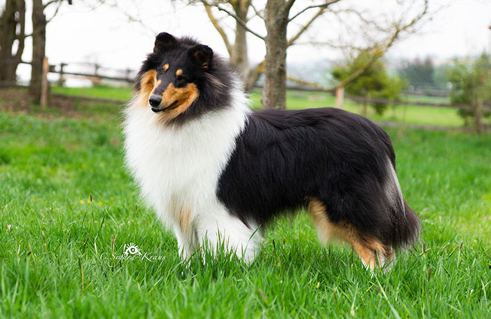 'JESSE' ist ein imposanter großer Rüde mit einem großen weißen Kragen. Er hat ein schönes rundes und ausgefülltes Vorgesicht mit einem kräftigen Unterkiefer und gerader Lippenlinie. Er hat mandelförmige schräg eingesetzte dunkelbraune Augen. Jesse hat eine lustiges und fröhliches Wesen. Er hat bereits vielversprechende Nachzucht im In- und Ausland gebracht. Jesse lebt mittlerweile bei einer ganz lieben Familie, wo er 100% Aufmerksamkeit erhält. Das Rudelleben war ihm im höherem Alter doch etwas zu trubelig. Ausstellungserfolge: German Junior Winner 2018 Bisheriger Zuchteinsatz: Kingswillow Glenoak Classic Scots Country-Roads Sanidas Diamonds 'JESSE' is an impressive bigger male with a big white colar. We love his full muzzle and pretty almond-shape darkbrown eyes. He loves life in general. Always happy. He produced some very promising offspring at home and abroad. Show results: German Junior Winner 2018 Previous breedings: Kingswillow Glenoak Classic Scots Country-Roads Sanidas Diamonds
