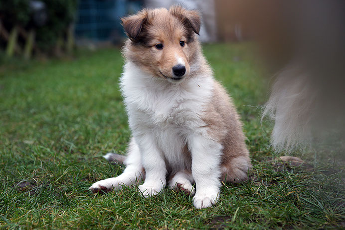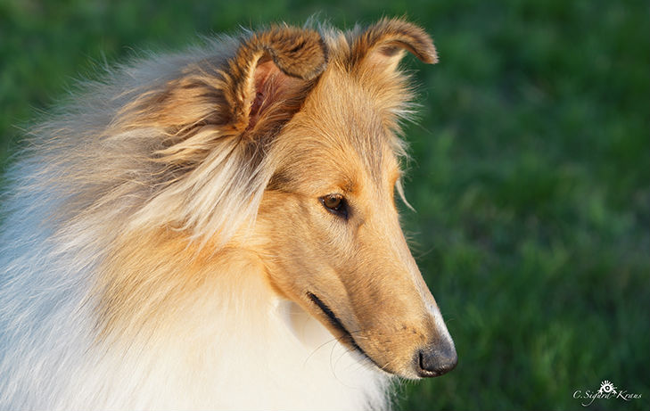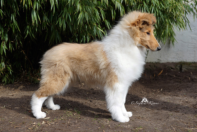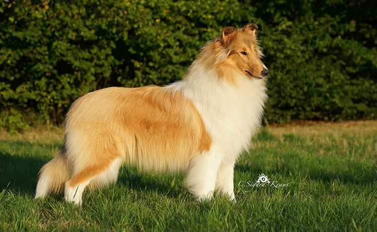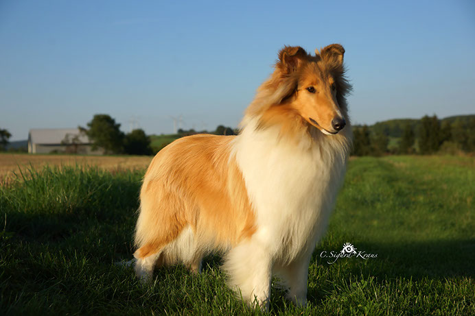 'ZIVAH' ist für uns eine wunderschöne Hündin, mit schönen Außenlinien. Sie hat einen edlen Kopf, der ihr einen femininen Ausdruck verleiht. Bei dem Training (Gehorsam) zeigt sich ihre Intelligenz und ihr Fokus. Sie hat ein schönes Gangbild und eine sehr lange Rute. Bei allen bisherigen Würfen, hat sie sich vorbildlich verhalten. Wir sind sehr zufrieden mit dieser tollen Hündin und erfreuen uns an ihrer Nachzucht. Zivah lebt mittlerweile bei ihrer Tochter aus dem R-Wurf, ganz in der Nähe von uns. So können wir sie von Zeit zu Zeit besuchen. In ihrem neuen zu Hause gibt es eine kleine Schafsherde und Zivah freut sich ganz besonders, wenn sie dort auf Lämmchen aufpassen darf. Leistungseignung: Obedience, Therapiehund 'ZIVAH' is a beautiful intelligent girl in our opinion. She has outline, style and a fabulous pedigree. Furthermore she has a good movement and a very long tail. We are very pleased with this pretty collie girl and are pleased with her wonderful offspring. Zivah now lives with her daughter from the R litter, very close to us. So we can visit from time to time. There is a small flock of sheep in her new home and Zivah is particularly happy when she is allowed to look after the little lambs there. Suitability: Obedience, Servicedog